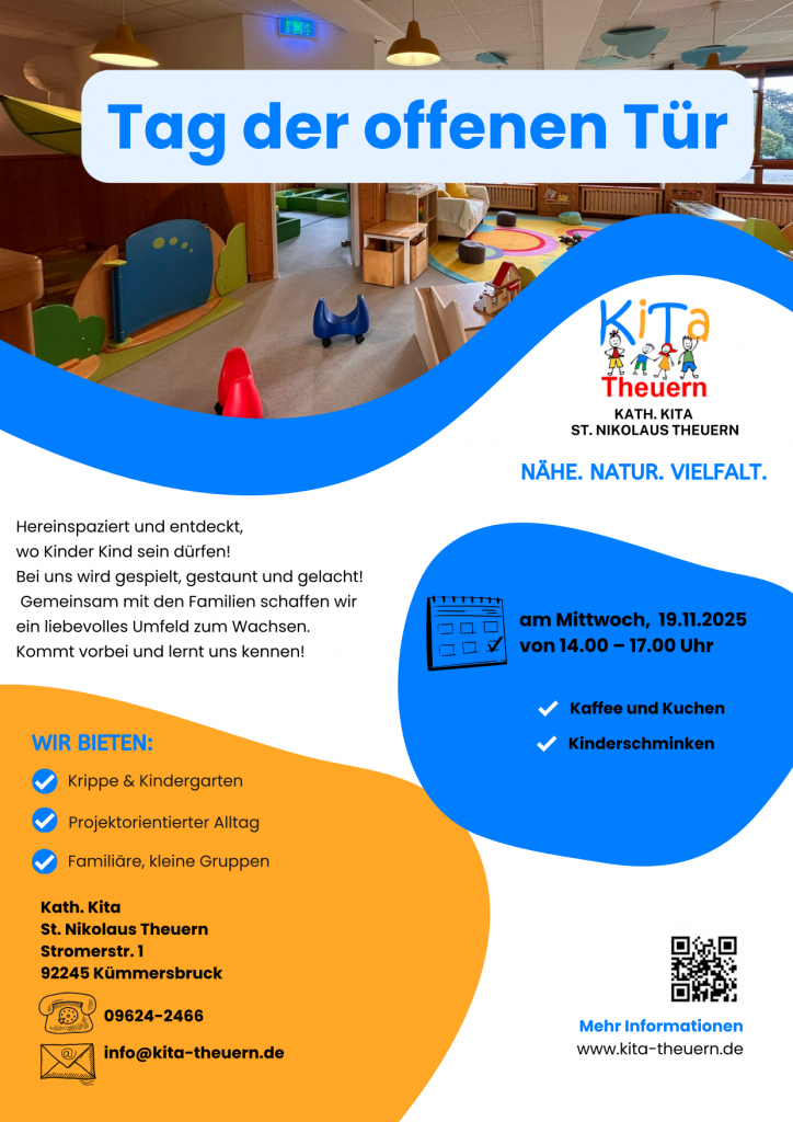 Auch dieses Jahre gibt es wieder einen Tag der offenen Tür. Alle Interessierten sind herzlich eingeladen, am Mittwoch, den 19. November, von 14 bis 17 Uhr unseren Kindergarten und das Team kennenzulernen. Es gibt Kaffee und Kuchen sowie Kinderschminken für die Kleinen. Wir freuen uns auf Ihren Besuch!